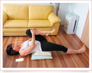 足を戻して、片足の膝に両手をかけ、胸に抱えるように手前に寄せる。もう一方の足は付け根(そけい部)がのびるように引きのばす。しばらくそのままで呼吸を続ける。反対側の足も同様に。