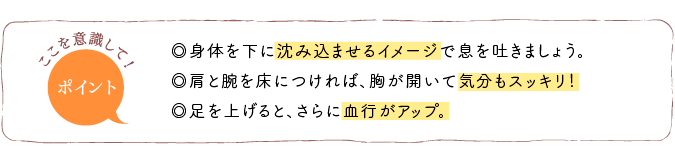 両足をゆっくりと上に上げる。呼吸は吐く息を長めにして、ゆったりと続ける。